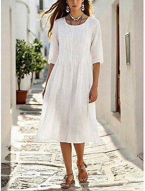 Femmes Robe Maxi Faux coton lin Robe Décontractée Mode Basique Moderne Quotidien Vacances Sortir Coupe Ample Uni Manche 3/4 Col ras du cou Bleu Rose Claire Rouge Vert Printemps Automne