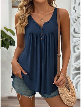 Femmes Débardeur Froncé Boutons Uni Élégant Classique Occasionnel Sans manches Col en V Hauts Réguliers Quotidien Week-end Noir Blanche Vin bleu marine Fuchsia Été Printemps