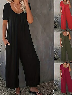Femmes Combinaison Actif Couleur Unie Manche Courte Jambe large Col ras du cou Avec Poches Quotidien Vacances Coupe Ample Noir Vin Rouge Été