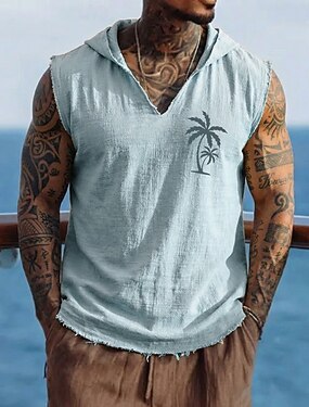 Débardeur à capuche sans manches pour homme, imprimé palmiers, style bohème tropical côtier, en coton et lin, ourlet brut effiloché, coupe ample, idéal pour la plage, les vacances d'été ou les