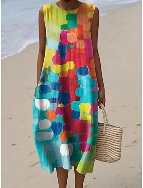 Robe Midi Femme Lin Comme Robe Shift Décontractée Plage Sortie Coupe Lâche Graphique Géométrique Sans Manches Col Rond Bleu Jaune Clair Jaune Violet Été Printemps