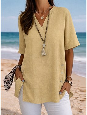 Femmes Chemisier Chemise en faux lin Boutons Couleur Unie Quotidien Élégant Basique Demi Manches Col en V Hauts Réguliers Quotidien Bleu Noir Jaune Rouge Violet Été Printemps Automne