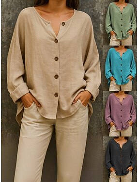 Femmes Chemisier Faux coton lin Boutons Couleur Unie Élégant Occasionnel manche longue Col ras du cou Hauts Réguliers Quotidien Bleu Noir Violet Vert Kaki Été Printemps Automne