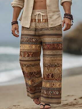 Homme Formes Géométriques Ethnique Pantalons Pantalons Amples Pantalon décontracté Taille Moyenne Boho Vintage Rétro Maison Extérieur Vacances Taille élastique avec cordon de serrage Pantalon en lin