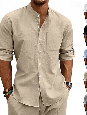 Homme Chemise Chemise en lin Chemise popover Chemise d'été Tenue de plage Couleur Unie Occasionnel Vacances Bleu Blanche bleu marine Vert manche longue Band Collar Été Printemps Vêtement Tenue