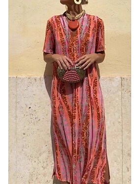 Robe Maxi Femme Lin Comme Respirant Léger Robe d'Été Robe A-Line Vacances Décontractée Boho Plage Coupe Ample Graphique Ombre Géométrique Manches Courtes Col V Bleu Rose Orange Vert Été Printemps
