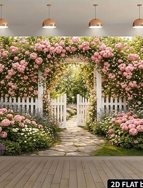 Tapisserie murale représentant un jardin de fleurs roses, une arche florale, un paysage champêtre et champêtre, idéale pour la décoration d'une chambre, d'un salon, d'une chambre d'étudiant ou d'une maison de campagne.