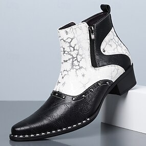 Bottines western noires et blanches pour homme, à bout pointu, avec fermeture éclair latérale, idéales pour les festivals de musique, les fêtes, les spectacles et les tenues de mode.