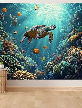 Tapisserie murale représentant une tortue marine, un récif corallien sous-marin et un paysage marin, idéale pour décorer une chambre, une salle de bain ou un salon.