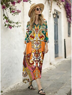 Robe Maxi Femme Lin Comme Respirant Léger Robe de Plage Robe A Ligne Vacances Casual Boho Plage Ajustement Lâche Graphique Paisley Manches 3/4 Col V Bleu Rose Orange Beige Été Printemps