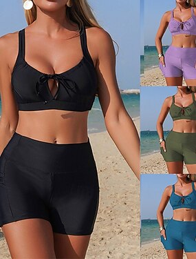 Femmes Maillots de Bain Bikini 2 pièces Jambe Garçon Maillot de bain Mince Dos nu Vacances Tenues de plage Uni Col en V Sans manches Maillots de bain