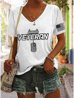 Jour de l'Indépendance Américaine Femmes T-shirt Imprimé Graphique Lettre Drapeau Américain Élégant Classique Occasionnel Manche Courte Col en V Hauts Réguliers Occasionnel Quotidien Bleu Noir