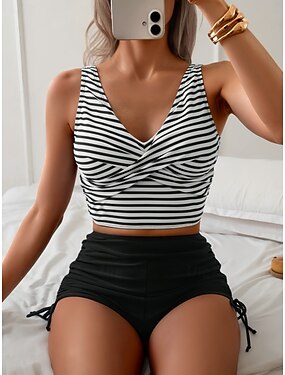 Maillot de bain 2 pièces bikini femme sexy ajusté sans dos vacances plage graphique rayé col en V sans manches