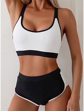 Maillot de bain deux pièces bikini femme colorblock culottes dos nu vacances plage vêtements color block U cou sans manches