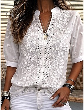 Femmes Chemisier Dentelle Œillet Couleur Unie Élégant Occasionnel Demi Manches Col en V Hauts Réguliers Quotidien Blanche Été Printemps