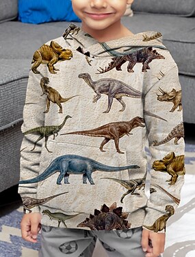 Sweat à capuche Garçon Enfants manche longue 3D effet Bande dessinée Dinosaure Beige Enfants Hauts Automne Actif Standard 4-12 ans