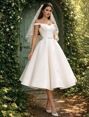 Robes de Douche Nuptiale Petite Robe Blanche Robes de Douche Nuptiale Robes Simples de Mariée A-Ligne Sans Épaules Manches Courtes Longueur Thé Satin Robes de Mariée Avec Couleur Unie 2024