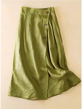Jupes midi basiques décontractées pour femmes, en faux coton et lin, taille haute, coloris unis, poche, style décontracté au quotidien et le week-end, noires, vert kaki, bleu marine, bleu marine, kaki, coton et lin d'été