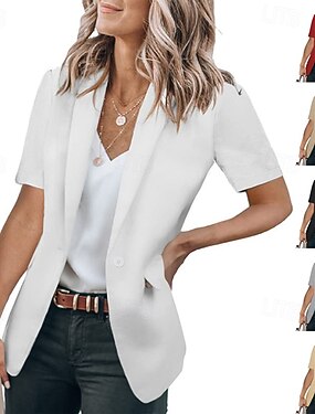 Femmes Blazer Respirant Confortable A Volants Occasionnel Uni Travail Tenue quotidienne Ouvert devant Régulier Col Rabattu Coupe régulière Manches courtes Vêtements d'extérieur Noir Blanche Rouge Été