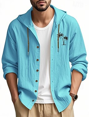 Homme Chemise Chemise en lin Chemise Décontractée Chemise Boutonnée Chemise en coton Cocotier Vacances Hawaïen Noir Blanche Bleu Ciel Kaki manche longue À capuche Printemps Automne Vêtement Tenue