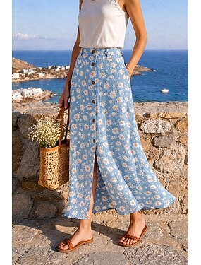 Femmes Jupe de vacances Occasionnel Boho Midi Taille Basse Jupes Fleuri Floral Imprimé Fendu Non Elastique Rue Sortir Bleu Ciel Été Mélange de coton Polyester