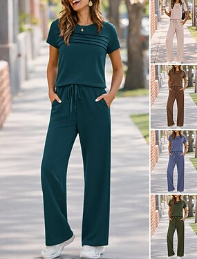 Femmes Ensembles de survêtements à enfiler Survêtement 2 pièces Tenues de détente Cordon de serrage avec poche Couleur Unie Ensemble de vêtements de sport Été Printemps Bleu marine Noir Entraînement