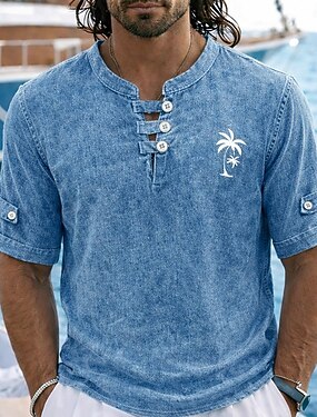 Homme Polo Chemise 100% coton délavée à l'acide Occasionnel Fête Sans Col Manche Courte Mode Basique Palmier Boutons Vintage Été Printemps Bleu Rouge Violet Vert Gris Polo
