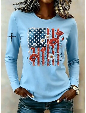 Jour de l'Indépendance Américaine Femmes T-shirt Imprimé Graphique Drapeau Drapeau Américain Élégant Classique Occasionnel manche longue Col ras du cou Hauts Réguliers Quotidien Bleu Beige clair Noir