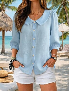 Femmes Chemisier Faux coton lin Boutons Couleur Unie Uni Élégant Occasionnel Manche 3/4 Col en V Hauts Longs Quotidien Blanche Vert Claire bleu marine Marron Abricot Été Printemps Automne