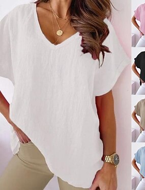 Femmes Faux coton lin Couleur Unie Uni Élégant Bohème ancien Manche Courte Col en V Hauts Réguliers Quotidien Bleu Noir Blanche Rose Claire Kaki Été Printemps Automne Hiver