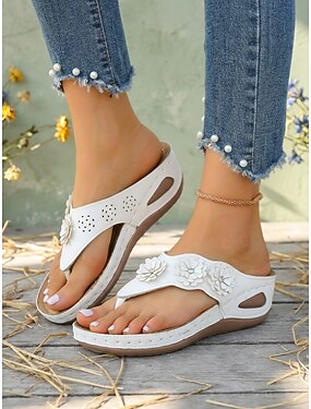 Sandales à enfiler pour femmes ornées de fleurs – sandales blanches confortables à entre-doigts avec détails floraux, parfaites pour les sorties décontractées, les journées à la plage et les vacances