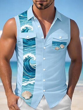 Homme Océan Coquillage Eau de mer Chemise Chemise hawaïenne Chemise Aloha Sans manches Resort Vacances à la Plage Été Printemps Col Rabattu Impression 3D Deux poches avant Chemises boutonnées Bleu