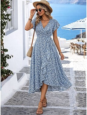 Femmes Robe Midi Robe Portefeuille Robe trapèze Vacances Occasionnel Extérieur Sortir Coupe Standard Fleuri Graphique Manche Courte Col en V Bleu Été Printemps