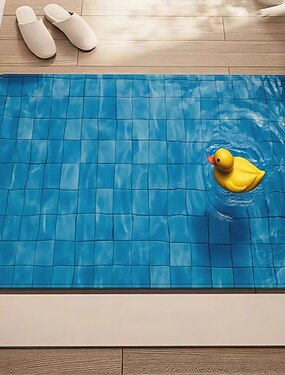 Tapis de porte à motif de carreaux de piscine bleus avec canard jaune flottant, impression 2D plate et illusion d'optique 3D, résistant et antidérapant, idéal pour la salle de bain ou le bord de la
