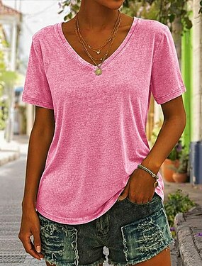 Femmes 100% Coton T-shirt Hauts effet délavé vintage Lavage à l'acide Uni Élégant Classique Manche Courte Col en V Hauts Réguliers Occasionnel Plage Bleu Rose Claire Violet Orange Vert Été Printemps