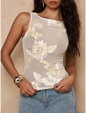 Femmes Débardeur T-shirt sans manches T-shirt Broderie Maille Fleuri Mode Classique Occasionnel Sans manches Col ras du cou Hauts Réguliers Quotidien Sortir Week-end Bleu Abricot Été Printemps