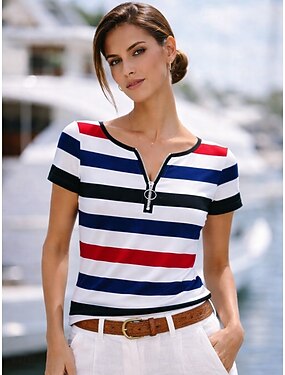 Femmes T-shirt Fermeture éclair Graphique Géométrique Rayé Élégant Classique Occasionnel Manche Courte Col ras du cou Hauts Réguliers Quotidien Sports Sortir Bleu Rose Claire Violet Gris Été Printemps