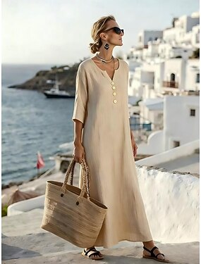 Robe maxi en lin pour femme similaire au coton robe d'été décontractée coupe régulière simple manches longues col en V bleu noir rouge foncé été printemps automne