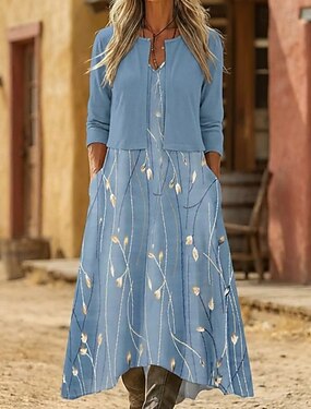 Robe décontractée pour femme, robe florale, mode quotidienne, coupe classique, manches courtes, robe longue, robe maxi, col ras du cou, rose, rouge, bleu, gris, automne