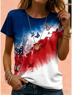 Jour de l'Indépendance Américaine Femmes T-shirt Imprimé Graphique Lettre Drapeau Américain Élégant Classique Occasionnel Manche Courte Col ras du cou Hauts Réguliers Quotidien Noir Rouge / Bleu Ét