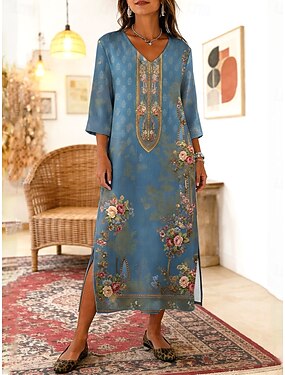 Femmes Robe Longue Maxi Robe Robe bohème Robe fourreau Robe d'Été Robe de Plage Bohème Vacances Ethnique Plage Fête Date Coupe Ample Fleuri Graphique Abstrait Manche 3/4 Col en V Bleu Vert Claire Ét