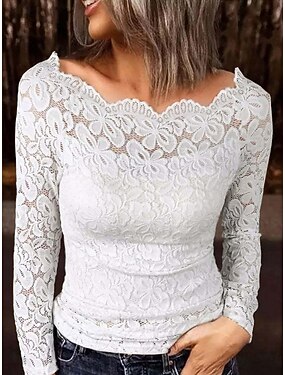 Femmes Chemisier Dentelle Patchwork Couleur Unie Élégant Basique Occasionnel manche longue Épaules Dénudées Hauts Réguliers Quotidien Noir Blanche Rouge bleu marine Vert Printemps Automne
