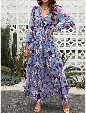 Femmes Robe Maxi Robe en Chiffon Robe Fleurie Robe Imprimée Élégant Mode Moderne Extérieur Vacances Date Coupe Ample Fleuri manche longue Col en V Jaune Bleu Roi Orange Vert Été Printemps