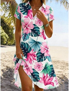 Femmes Mini Robe Robe trapèze Vacances Occasionnel Boho Quotidien Plage Coupe régulière Fleuri Graphique Manche Courte Revers Bleu Rose Claire Vert Été Printemps