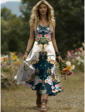 Robe Midi Femme Boho Arbre de Vie Merkabah Robe de Plage A Ligne Vacances Décontractée Fête Sortie Ajustement Standard Graphique Floral Feuille Sans Manches Col U Bleu Vert Foncé Violet Vert Été