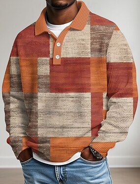 Homme Bloc de Couleur Chemises Polo Gaufre Texturé manche longue Polos Revers Occasionnel École Athleisure Tenue quotidienne Impression 3D Automne & Hiver Bleu Orange Vert