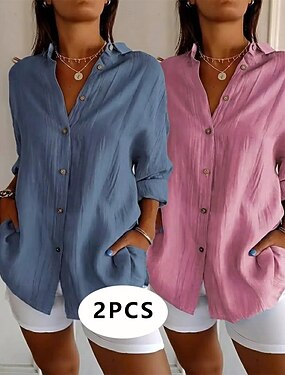 Blouse en lin comme du faux coton à boutons couleur unie stylée décontractée manches longues col rond longs hauts quotidien bleu noir jaune fuchsia gris printemps automne
