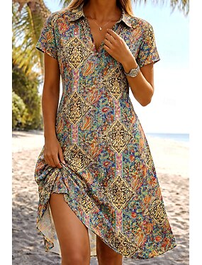 Femmes Robe Midi Robe trapèze Vacances Occasionnel Boho Plage Coupe régulière Graphique Motif cachemire damassé bohème Manche Courte Col en V Vert Été Printemps