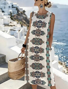 Robe Midi Femme Lin Comme Robe de Plage Robe Shift Robe A-Line Vacances Décontractée Boho Plage Sortie Coupe Lâche Graphique Géométrique Sans Manches Col Rond Bleu Été Printemps