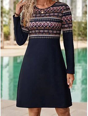 Femmes Mini Robe Robe T-Shirt Robe fourreau Robe d'été Vacances Occasionnel Quotidien Soirée Coupe régulière Graphique Géométrique manche longue Col ras du cou Bleu de minuit Printemps Automne Hiver